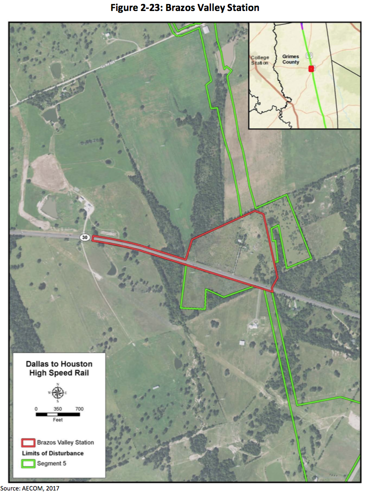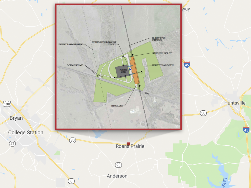 In late December, the Federal Railroad Administration (FRA) released its Draft Environmental Impact Statement (DEIS) for the Texas Bullet Train, which, for the first time, outlined the location of the railroad’s Brazos Valley Station. The only stop on the Train’s daily journeys between North Texas and Houston will be in Grimes County – to be located on a 60-acre plot of land on Highway 30, just west of Highway 90, in the Roans Prairie area, about equidistant between College Station and Huntsville.