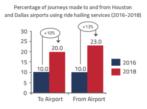 And, as ride hailing options continue to expand, access to and from stations will become easier, even if you don’t have your own car. Texans’ use of ride hailing services, such as Uber and Lyft, has been growing steadily. Surveys show that between 2016 and 2018 the proportion of travelers using ride hailing to travel to and from airports has doubled in only two years! Nearly 80% of travelers that use ride hailing services indicated that either they “definitely” or “probably would” travel by the high-speed train on their next journey, greater than the Texan average of 72%.